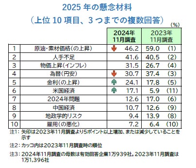 - 2025年の景気への懸念材料、トップは「原油・素材価格(の上昇)」(46.2%)で前年から12.8ポイント低下(複数回答3つまで)。「金利」(24.1%、前年比6.3ポイント増)、「米国経済」(17.1%、前年比11.2ポイント増)が前年より急増