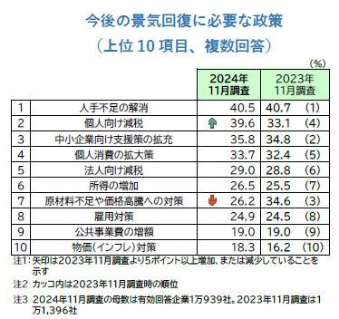- 今後の景気回復に必要な政策、「人手不足の解消」(40.5%、前年比0.2ポイント減)が引き続きトップ(複数回答)。そのほか、個人向けの減税や消費拡大策が重視される結果に
