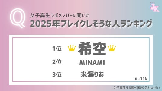 「2025年にブレイクしそうな人」のランキングでは、辻希美さんの娘で、17歳の誕生日に顔出しをした希空さんが1位に輝きました。第2位にはSNS総フォロワー数約480万人の現役女子高校生インフルエンサーのMINAMIさん、第3位に高校生に人気の恋愛リアリティーショーでカップル成立し、話題沸騰中の米澤りあさんがランクインしております。