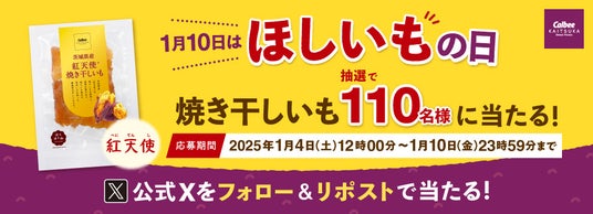 カルビーかいつかスイートポテト株式会社(本社:茨城県かすみがうら市、代表取締役社長:安藤 國行)は、「ほしいもの日」(1月10日)を記念して、濃厚な蜜の甘さと焼き芋の香ばしさが特長の『紅天使 焼き干しいも』が当たるプレゼントキャンペーンを2025年1月4日から1月10日まで実施いたします。