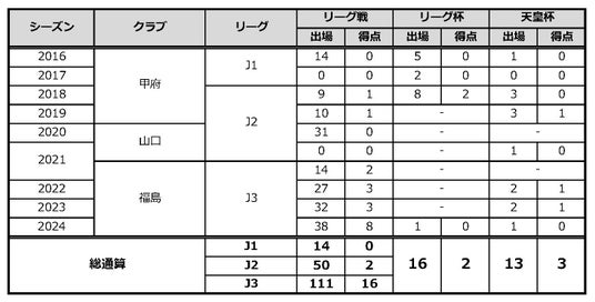 サッカー歴:名古屋グランパスU12→名古屋グランパスU15→名古屋グランパスU18→ヴァンフォーレ甲府→レノファ山口FC→福島ユナイテッドFC