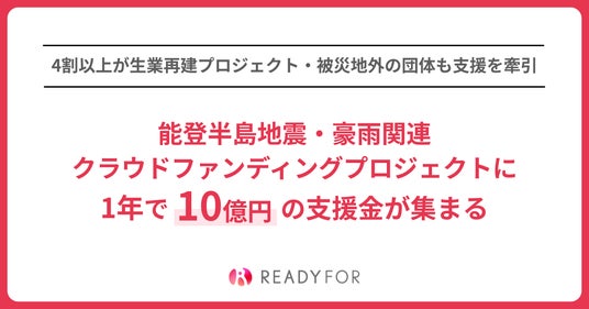 READYFOR株式会社(代表取締役CEO:米良はるか、本社:東京都千代田区)は、日本初・国内最大級のクラウドファンディングサービス「READYFOR」において、能登半島地震および豪雨被害に関連するプロジェクトへの累計支援額が10億円に到達いたしましたことをお知らせいたします。(2024年12月23日時点)