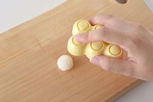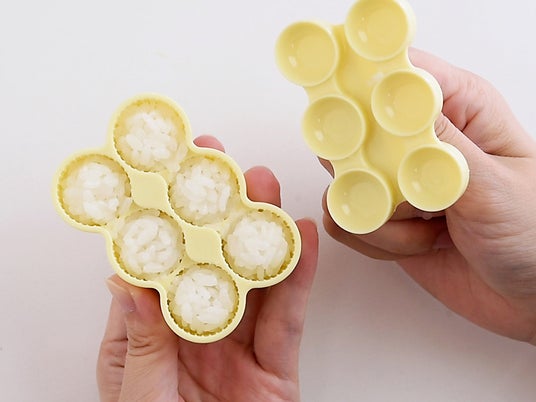「こむすびベビーmini×2」は、おにぎり型の内側の 凸凹と、押し出せる部分を作り、おにぎりをにぎった後に取り出しやすくする工夫をしました。