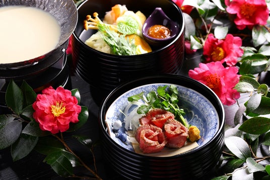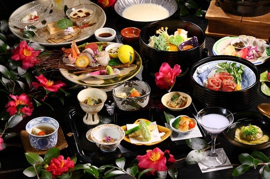 奥湯河原温泉・海石榴では12月1日(月)より、お題目を「奥湯河原の冬 星冴ゆる 冬牡丹と寒椿」とし、旬の食材と器で表現した“冬のお献立”を始めました。