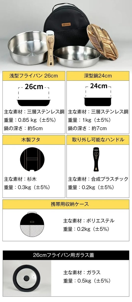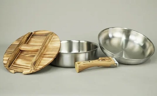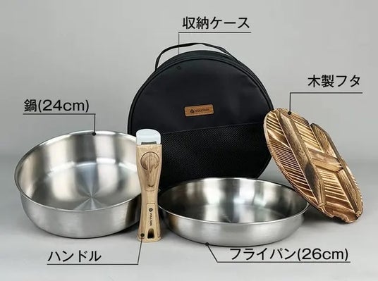 VOLLTAIN-POTは、アウトドアと家庭の両方で使える万能なクッキングセットです。セット内容は、調理の幅を広げる「フライパン(浅鍋)」と「深鍋」、取り外し可能で収納しやすい「着脱可能なハンドル」、自然の温もりを感じる「木製鍋蓋/鍋敷き」、そして全てをコンパクトにまとめられる「携帯用収納バッグ」の5点。