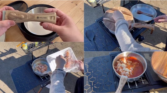 自宅とキャンプでフライパンを使い分けるのは、収納場所を取るしコスパも悪い。このフライパン鍋セットなら取手が外せ自宅での収納やキャンプでの