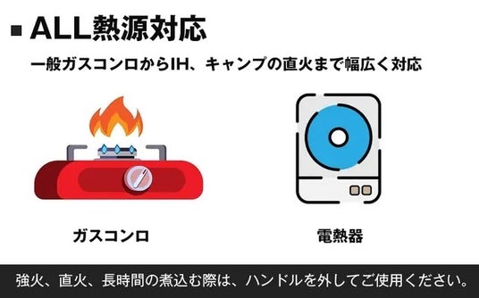 ・火源が底面を超える場合や、キャンプでの直火で火源が不安定な場合、長時間煮込む場合はハンドルを外してご利用ください。ハンドルが損傷する場合がございます。