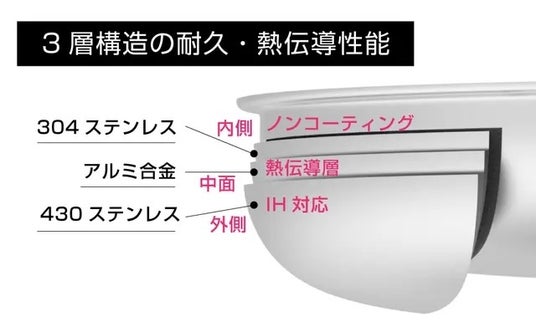 1.【ノンコーティング】×【三層ステンレス】製!焦げ付きにくく、均等に熱が伝わる調理性能!