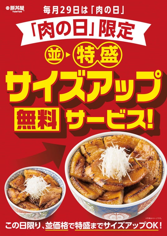 ワンズトライン株式会社(本社:大阪市北区芝田2丁目3番16号、代表取締役:山内仁)が運営する、北海道・帯広伝統の豚丼が人気の「元祖豚丼屋TONTON」では、毎月29日を“肉の日”として感謝デーを実施しています。