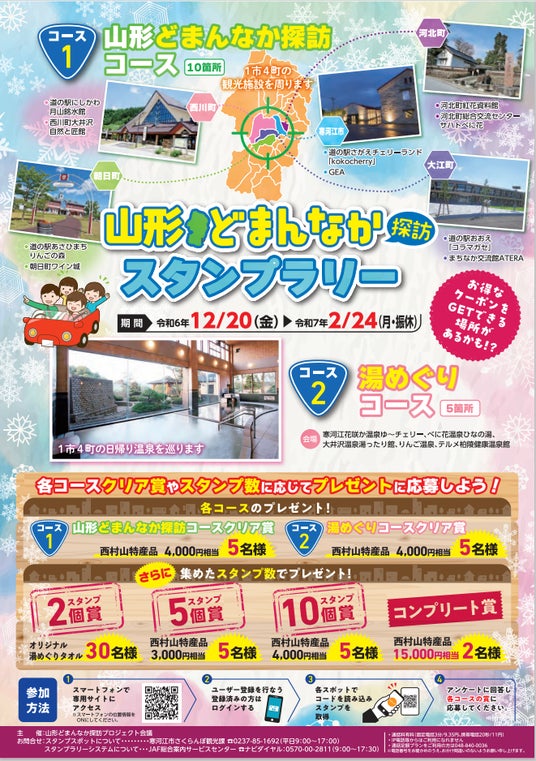 JAF(一般社団法人日本自動車連盟)山形支部(支部長 高橋 修)は、山形どまんなか探訪プロジェクト会議が主催し、12月20日(金)から翌年2月24日(月)まで開催されている「山形どまんなか探訪スタンプラリー」に協力しています。