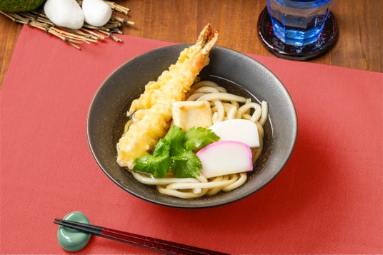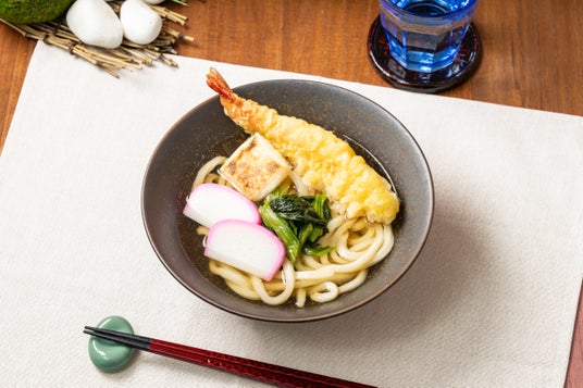 うどんと海老天、「縁を結ぶ」三つ葉とともに
