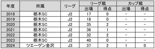 益子SC ストラーダ - JEF 宇都宮 - 鹿島学園高校 - 仙台大学 - ヒラル・マロク・ベルグハイム(ドイツ) - TuS エルンテブリュック(ドイツ) - 栃木SC - ツエーゲン金沢