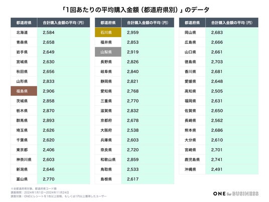 第2位は「山梨県(2,919円)」、第3位は「福島県(2,906円)」となり、都市部よりも物価が比較的安い地域がランクインしました。地方在住者は、都市部よりもまとめ買いをする傾向があり、1回あたりの平均購入額が上がっているのかもしれません。