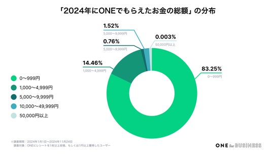 ONEユーザーの年間の総獲得金額を調査したところ、大多数のユーザーは今年ONEでもらえたお金が「0~999円(83.25%)」でした。ついで、「1,000~4,999円(14.46%)」「10,000~49,999円(1.52%)」「5,000~9,999円(0.76%)」という結果になりました。