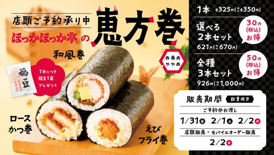 持ち帰り弁当事業のパイオニアである「株式会社ほっかほっか亭総本部(本社:大阪府大阪市、代表取締役会長兼社長:青木達也)は、2025年1月4日(土)より、「恵方巻」の店頭ご予約を開始いたします。