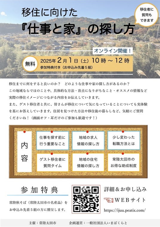 茨城県常陸太田市では、移住のきっかけづくりとなるオンラインイベントを開催します。本市での暮らしや魅力を紹介するとともに、移住の方法・盲点になりがちなことなどについて、ゲスト移住者とともに答えます。