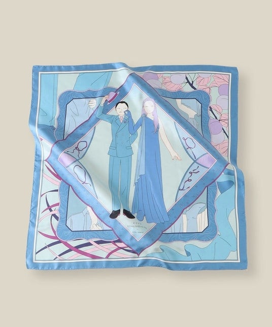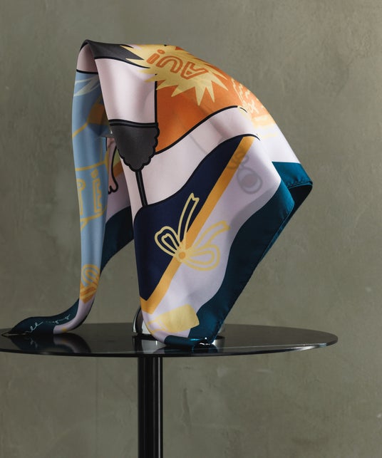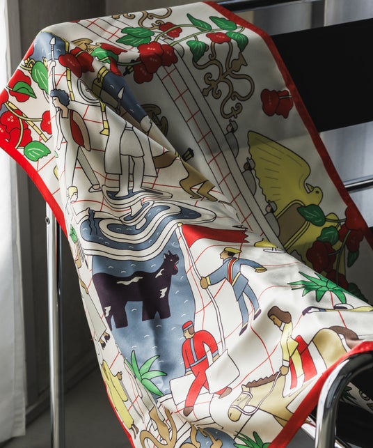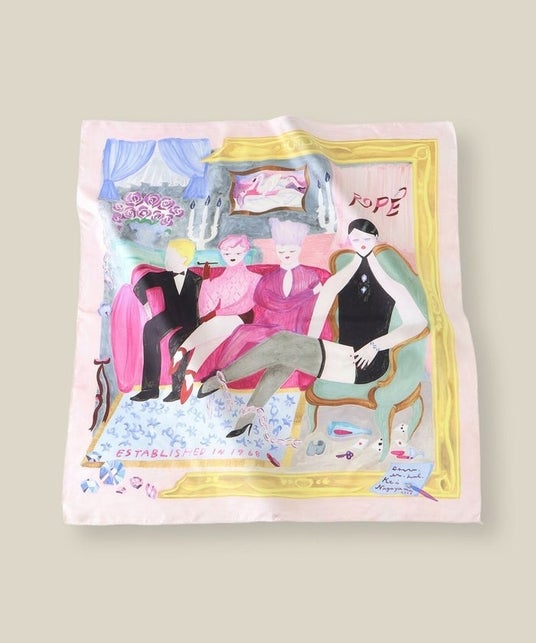 著名な写真家やアーティストの手掛けてきた、60 年代から現代に至るまでの「ROPE」のブランドビジュアルやムービーの中から4 作品をテーマに、4 名のアーティストがそれぞれ独自の視点で再解釈しデザインを描きました。スカーフの素材は、程よい厚みと光沢のあるツイル調シルク生地で、その上に色鮮やかなデザインをプリント。