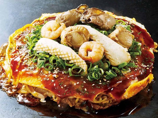 広島県産大粒牡蠣と海鮮が入ったお好み焼き。