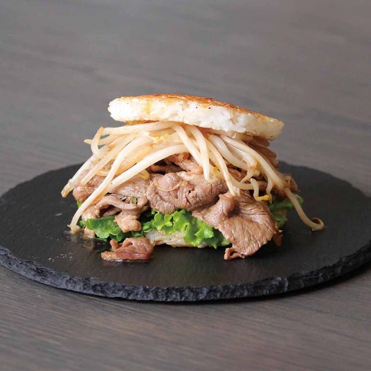 特製ダレで味付けしたラムジンギスカンがはみ出るライスバーガー。