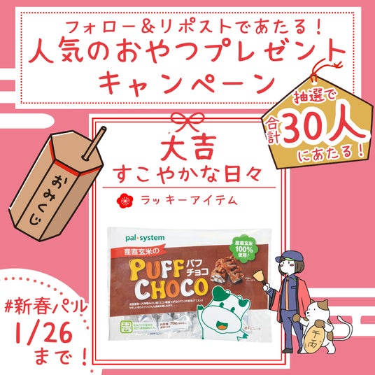 生活協同組合パルシステム東京(本部:東京都新宿区大久保、理事長:松野玲子)は1月6日(月)から、公式SNSキャンペーン「#新春パル」を開始します。参加者の中から抽選で30人に、人気の商品のお菓子をプレゼントします。産直提携を結ぶ農業協同組合産の小麦や米を使用した商品を紹介し、国産消費を応援します。