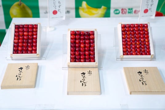 新年初競りで注目の目玉商品、山形県産の超促成栽培「佐藤錦」について