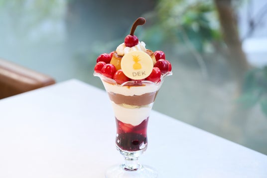美しいルビー色の「佐藤錦」とDEK特製の濃厚カスタードプリンが主役のプリンパフェ。