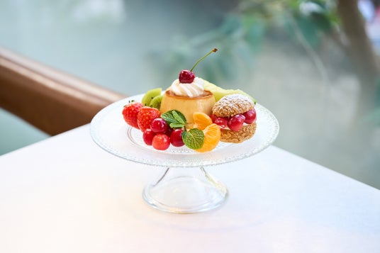 「佐藤錦」をメインに、旬のフルーツとDEK特製カスタードプリンを彩り豊かに盛り合わせた 一皿。少し硬めでクラシカルなカスタードプリンは、たまごの濃厚な風味が際立ちます。