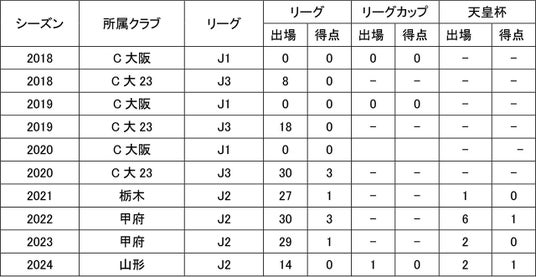 所属歴/喜連東FC - セレッソ大阪U-15 - セレッソ大阪U-18 - 栃木SC - ヴァンフォーレ甲府 - モンテディオ山形