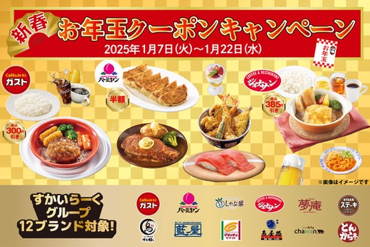 株式会社すかいらーくレストランツ(本社・東京都武蔵野市、代表取締役社長 中島 尚志)が運営するガストなど12ブランドで、総数53種のお得なクーポンを「すかいらーくアプリ」にて配信する“新春”「お年玉クーポンキャンペーン」を、2025年1月7日(火)より開始いたします。