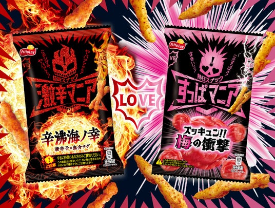 「コーンスナック」を中心にスナック菓子を製造・販売するジャパンフリトレー株式会社(カルビーグループ、本社:茨城県古河市、代表取締役会長兼社長:石辺 秀規)は、“マニアのための衝撃的な味わい”が特徴のコーンスナック「マニアシリーズ」より、刺激的な“愛”がテーマの寒い冬にぴったりな、新フレーバー『激辛マニア 辛沸海ノ幸』と『すっぱマニア ズッキュン!!梅の衝撃』の2種を発売します。