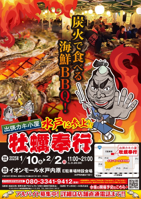 宮城県石巻の牡蠣をセルフ炭火焼き(海鮮BBQ)で楽しむ「出張カキ小屋 牡蠣奉行」(TEL 080-3341-9412)が1月10日、イオンモール水戸内原(茨城県水戸市)E駐車場特設会場に期間限定オープン。