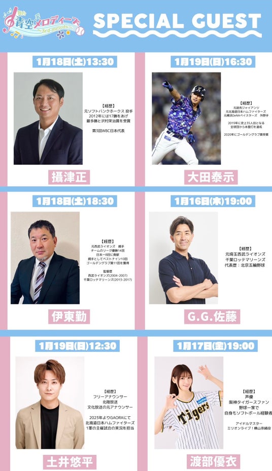 西武ライオンズの捕手としてベストナイン10回、ゴールデングラブ賞11回を獲得し西武ライオンズの黄金期を支えた「伊東勤」。現在、バラエティ番組やSNS等で幅広く活躍している元西武ライオンズ「G.G.佐藤」。2012年には17勝をあげ最多勝と沢村栄治賞を受賞した元ソフトバンクホークス投手の「攝津正」。ジャイアンツ、日本ハム、最後は元横浜DeNAベイスターズに所属し、2020年にはゴールデングラブ賞受賞した「大田泰示」。