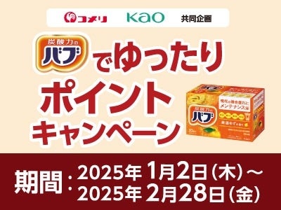 コメリ・花王 共同企画「炭酸力のバブでゆったりポイントキャンペーン」条件:期間中、花王バブシリーズを同日同店舗でお買い上げ税込1,500円を1口として、抽選でポイントプレゼント。