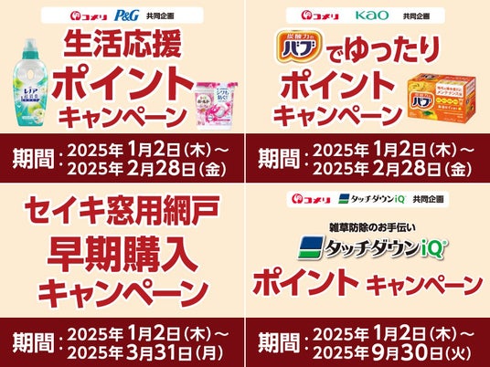 ホームセンターの「コメリパワー」や「コメリハード&グリーン」を通し地域のライフラインであり続けたいと願う株式会社コメリ(所在地:新潟県 新潟市、代表取締役社長:捧 雄一郎)は、コメリの決済手段「コメリカード」「アクアカード」会員様向けに、2025年1月より4種のキャンペーンを新たにスタートいたしました。