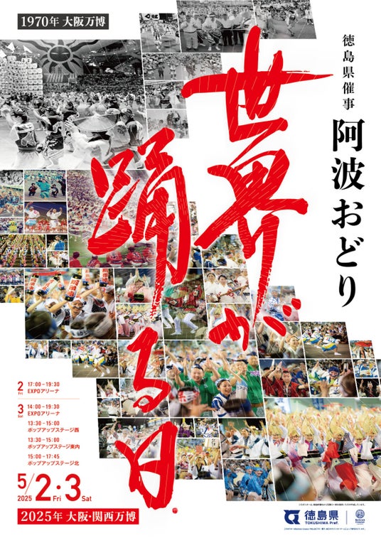 万博では非日常的な体験を求めて多種多様な人々が多く訪れること、阿波おどりの歴史的な一日になるであろうことから、「世界が踊る」と力強い筆文字で表現しました。また、連綿と続く阿波おどりの歴史を感じられるよう、1970年に実施した大阪万博で撮影された写真を使用し、現在へと続く流れが渦のように未来へと向かっていく様子を表しています。