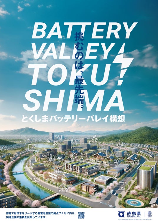 蓄電池関連企業の拠点となる未来の徳島の風景をイメージし、アイキャッチ性を高めながら目指す未来を明るく表現しました。蓄電池産業の先進県に向けたキャッチコピーを配置し、構想の存在を印象深いものに仕上げています。