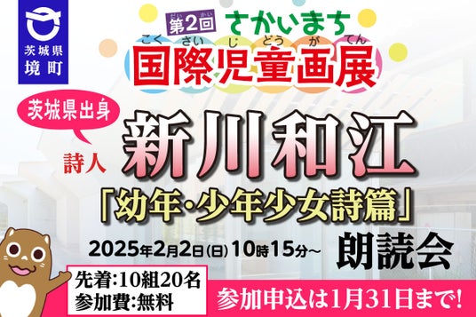 2024年12月18日から開催中の「第2回さかいまち国際児童画展」において、茨城県出身の詩人・新川和江の詩集「幼年・少年少女詩篇」の朗読会を開催します。先着10組20名、参加費無料です。