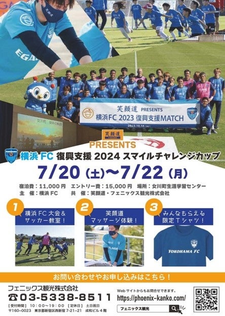 この度、株式会社爽健グローバル (本社:東京都新宿区、代表取締役:福田秀人、以下爽健グローバル)が運営する「笑顔道鍼灸接骨院グループ」は、2024東日本大震災復興支援活動として株式会社横浜フリエスポーツクラブ(本社:神奈川県横浜市、代表取締役社長COO:片原 大示郎)が運営するプロサッカーチーム「横浜FC」とフェニックス観光株式会社(本社:東京都新宿区)と共に「笑顔道PRESENTS 横浜FC復興支援 2024 スマイルチャレンジカップ」を開催いたします。
