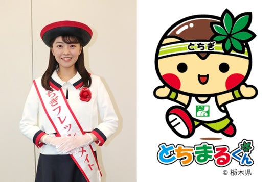 栃木県庁前のトチノキからうまれたマスコットキャラクター「とちまるくん」と、栃木県産農産物を全国に向けてPRする「とちぎフレッシュメイト」が、お客様をお出迎えいたします。