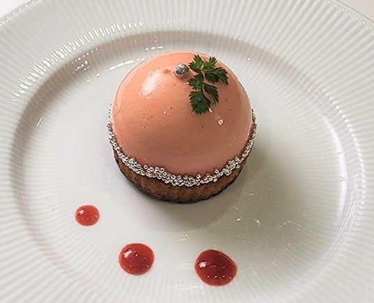 いちごの香りを感じつつ、舌の上ですっと溶けるいちごとりんごのグラニテに、シュトロイゼルとやわらかい印象のバニラホワイトチョコクリームを合わせました。その間には、ほんのりと香る国産柑橘のソースを重ねています。