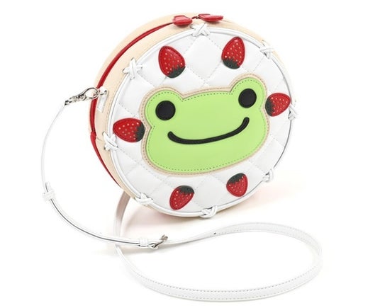 ホールケーキの真ん中に「かえるのピクルス」のお顔をあしらったユニークなデザインのショルダーバッグ。立体感のあるキルティングに、細部まで作り込んだいちごの革パッチが付いています。小ぶりで二つ折り財布が入るサイズ感で、内にはポケットが付いており、細かな荷物は分けて収納できます。