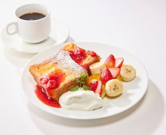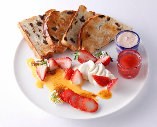 バター香るデニッシュブレッドのフレンチトーストに、「神奈川県産湘南いちご」のピューレをトッピング。フレッシュフルーツとともにお楽しみください。
