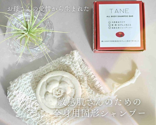 ・ TANE全身シャンプーバー(たね):アトピーに悩む息子のために開発。東京都利島の椿を種まで丸ごとフル活用。肌と同じ弱酸性で無香料。介護施設でも使用されており、ベビーや敏感肌の方にも最適です。