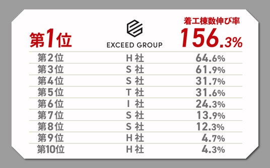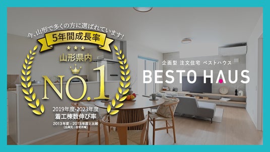 山形県を拠点に住宅事業を展開する株式会社EXCEED(代表取締役:冨樫 宜信)は、過去5年間(2019年度~2023年度)の着工棟数累計実績において、成長率で圧倒的No.1を記録しました(※)。直近5年間の実績は、過去の5年間(2013年度~2018年度)に比べ156%増加し、2位の65%を大きく引き離す結果となりました。この成果には、弊社が手掛ける住宅ブランドBESTO HAUS(ベストハウス)が大きく貢献しています。