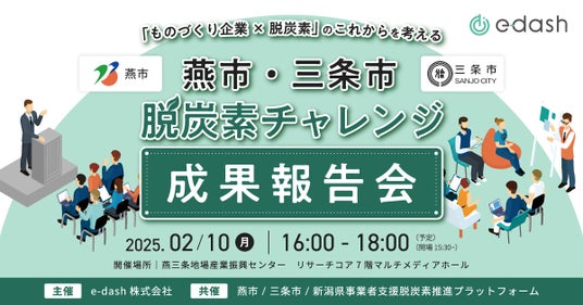 CO2排出量可視化・削減サービスプラットフォーム「e-dash」を提供するe-dash株式会社(本社:東京都港区、代表取締役社長:山崎冬馬、読み:イーダッシュ、以下「当社」)は2月10日(月)、燕市(市長:鈴木力)、三条市(市長:滝沢亮)、新潟県事業者支援脱炭素推進プラットフォームと共催で、当社と燕市、三条市が実施する市内中小企業を対象とした脱炭素支援プログラムの成果報告を通じて「ものづくり企業×脱炭素」のこれからを考えるイベントを開催します。