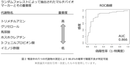 本研究では、薬やサプリメントなどの摂取をしていない45~60歳の日本人男性730名を対象としてPSQIによる睡眠の評価を行い、そのうち睡眠に問題のない(PSQI ≦ 2)対照群50名と睡眠に問題があると考えられる(PSQI ≧ 6)睡眠不良群50名から起床後の唾液を採取し、CE-FTMSによるメタボローム解析によって唾液中に含まれる代謝物の解析を行いました。検出された683種類の代謝物のうち、半数以上の被検者で検出された435代謝物のデータを用いてランダムフォレスト解析を行いました(図1)。ランダムフォレスト解析によって対照群と睡眠不良群を判別するために重要な六つの代謝物が明らかになりました(図2左)。これらの代謝物を用いて睡眠不良を予測する判別モデルを作成し(ROC曲線)、AUCを用いて判別性能を評価しました(図2右)。その結果、PSQIスコアによって判定した睡眠不良者を86.6%の確率で判別できることがわかりました。六つの代謝物の中には、腸内または口腔内の細菌由来と考えられるものも含まれており、これらの細菌と睡眠不良の関連性が示唆されました。