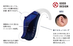 耳かけ型補聴器のデザインは、全体的にボリューム感を抑えたスリムな形状としました。また、補聴器を装用しながらでもボタン操作しやすいよう、突起部分を設け、指先の感覚だけでボタンの位置を把握できるようにしています。