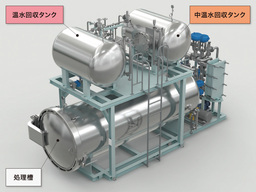 本装置は主に、レトルト食品や医薬用輸液バッグ等の製造工程で使用されており、製品を装填する処理槽と製品加熱後の水(約120℃)を回収する温水回収タンク、製品予冷後の水(約90℃)を回収する中温水回収タンクを基本構成とし、回収タンクのない従来品で排出していた熱を2つのタンクに蓄熱し、次工程の予熱及び加熱に再利用することで従来品比で最大50%の蒸気使用量削減を実現します。