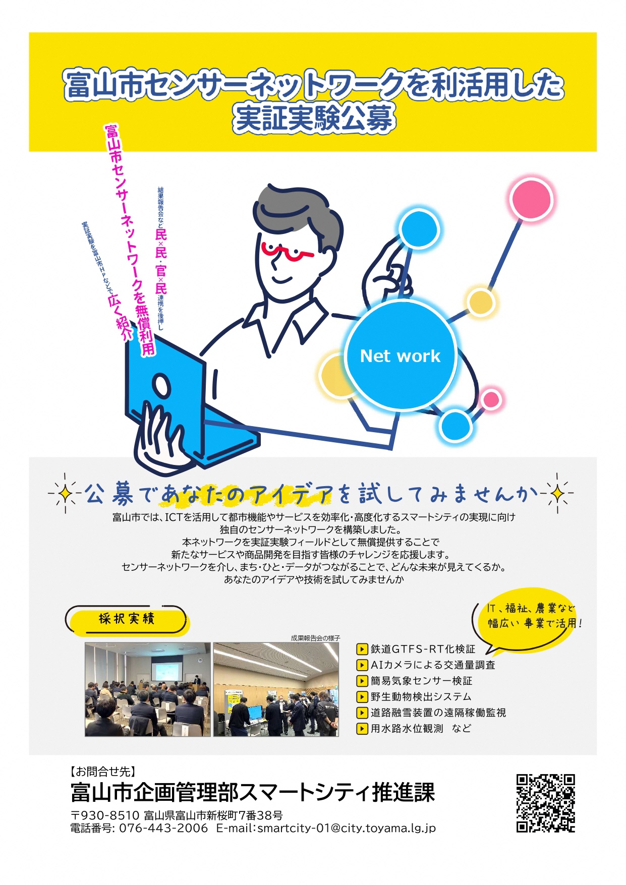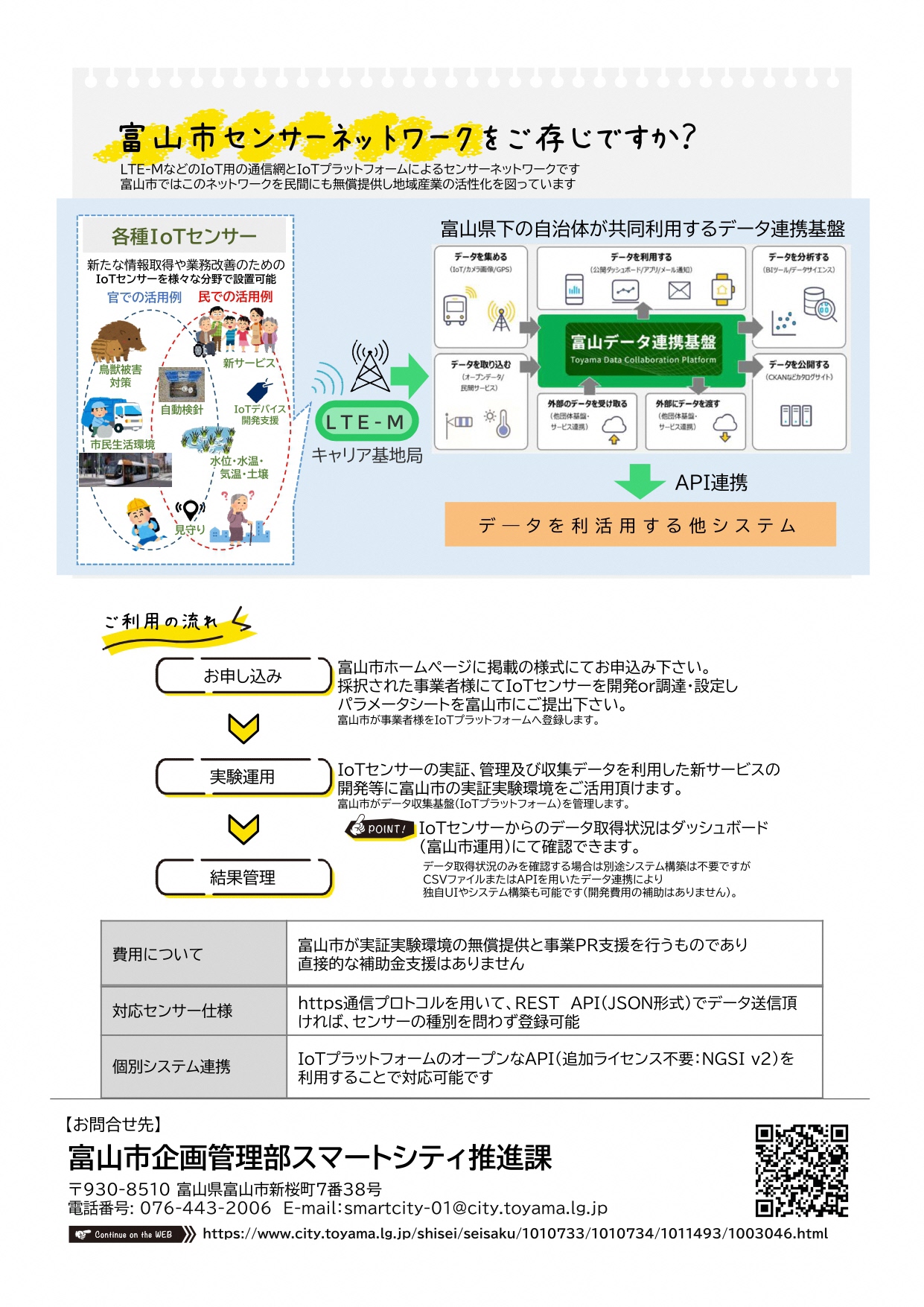 本市では、この富山市センサーネットワークを実証実験フィールドとして無償提供することで、新たなサービスや商品開発を目指す皆様のチャレンジを応援します。