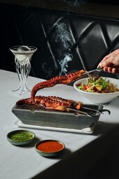ギリシャ風タコのグリル:柔らかくグリルしたタコに、ロースト・ポテト、ペキニージョ・ペッパー、カラマタ・オリーブ、オレガノを添えた繊細な地中海料理。太陽を感じさせる、ギリシャとスペインの調和のとれた風味へのオマージュです。